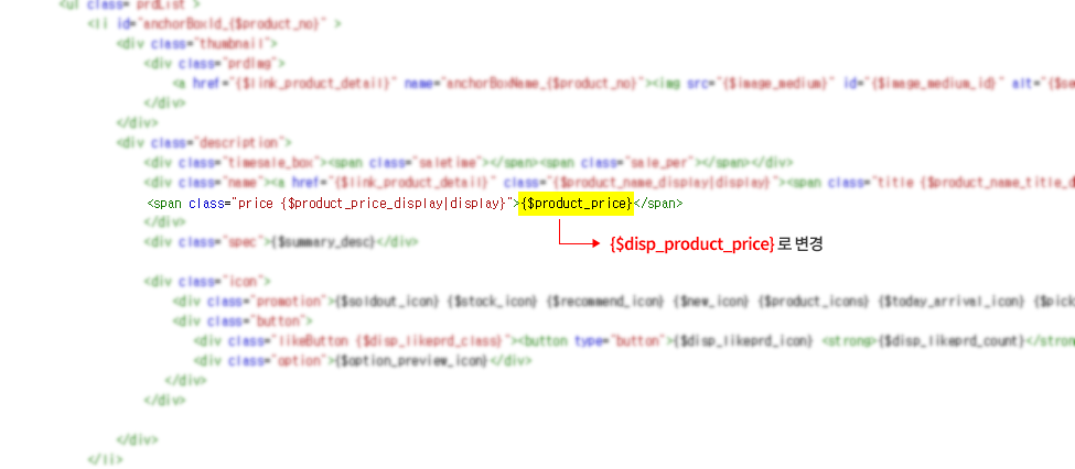 주의할 점은 앞 부분의 {$product_price_display|display}는 $disp_를 추가하지 않고 그대로 두어야 한다는 점!