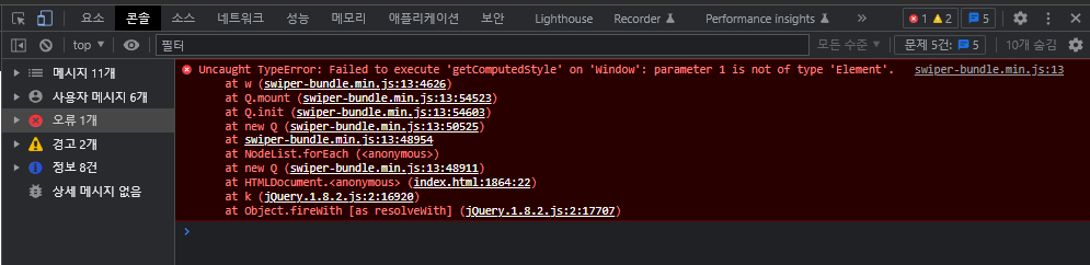 잘 쓰고 있던 swiper 스크립트에서 어느날 갑자기 이런 오류가 떴다.